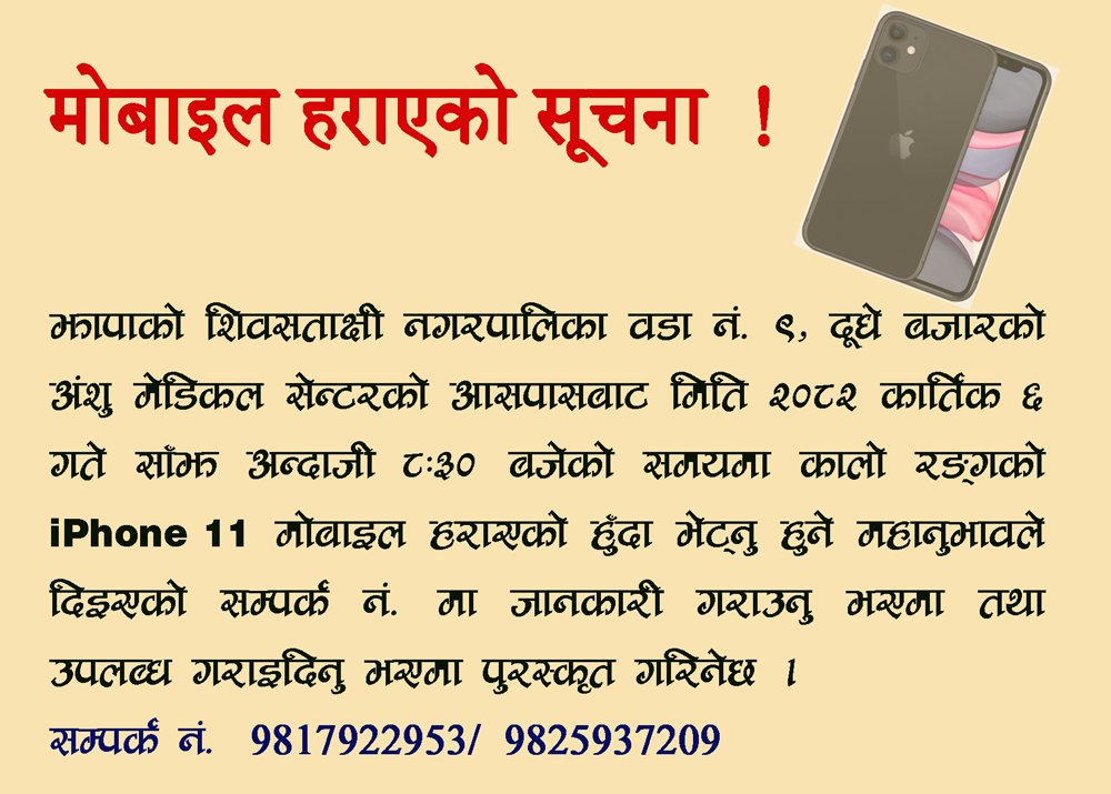 गृहपुष्ठ जिल्ला प्रदेशमोबाइल हराएको सूचना admin2 months ago01 mins Post navigation Previous: स्वर्गीय पवन चाम्लिङ राई : एक अमर स्मृतिNext: दुई दिन सर्यो झापा महिला गोल्डकप Leave a Reply Cancel replyYour email address will not be published. Required fields are marked *Comment * Name * Email * Website Save my name, email, and website in this browser for the next time I comment.